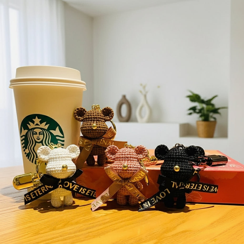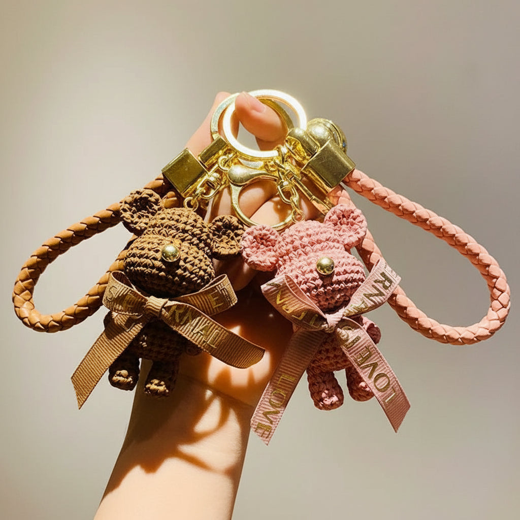 Say hello to the sweetest little travel buddy! These adorable knit bear keychains add a soft, stylish touch to backpacks, purses, tote bags, car keys, or even slime storage bags. Each bear comes with a chic ribbon detail and gold hardware for that perfect aesthetic vibe — cute, soft, and totally ...