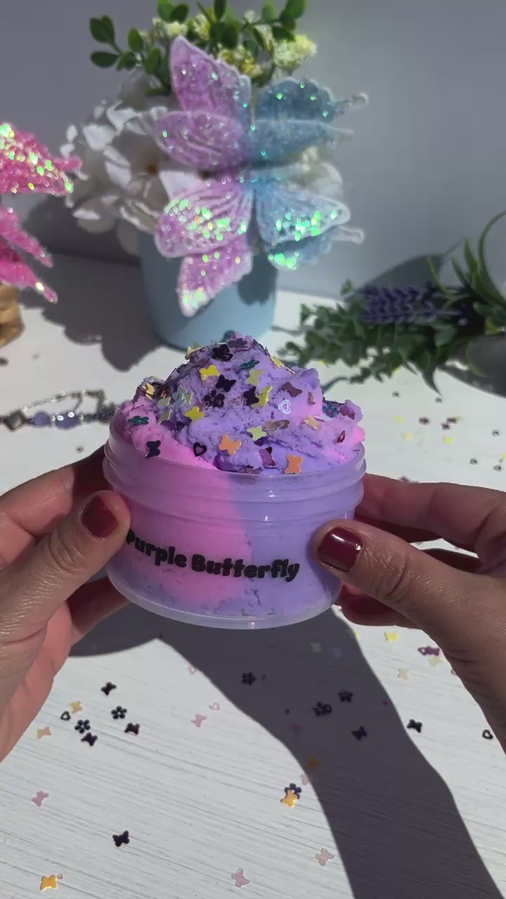 Let your imagination take flight with Purple Butterfly Slime!  This soft & fluffy cloud slime features a magical swirl of pink and purple that looks like a butterfly fluttering through a cotton candy sky.