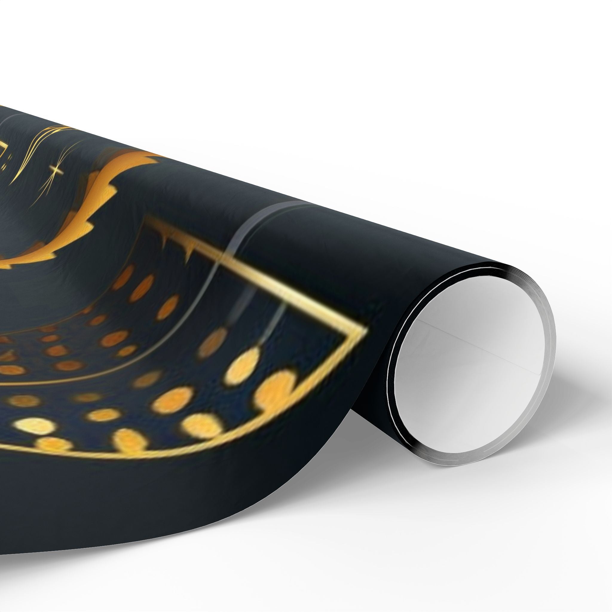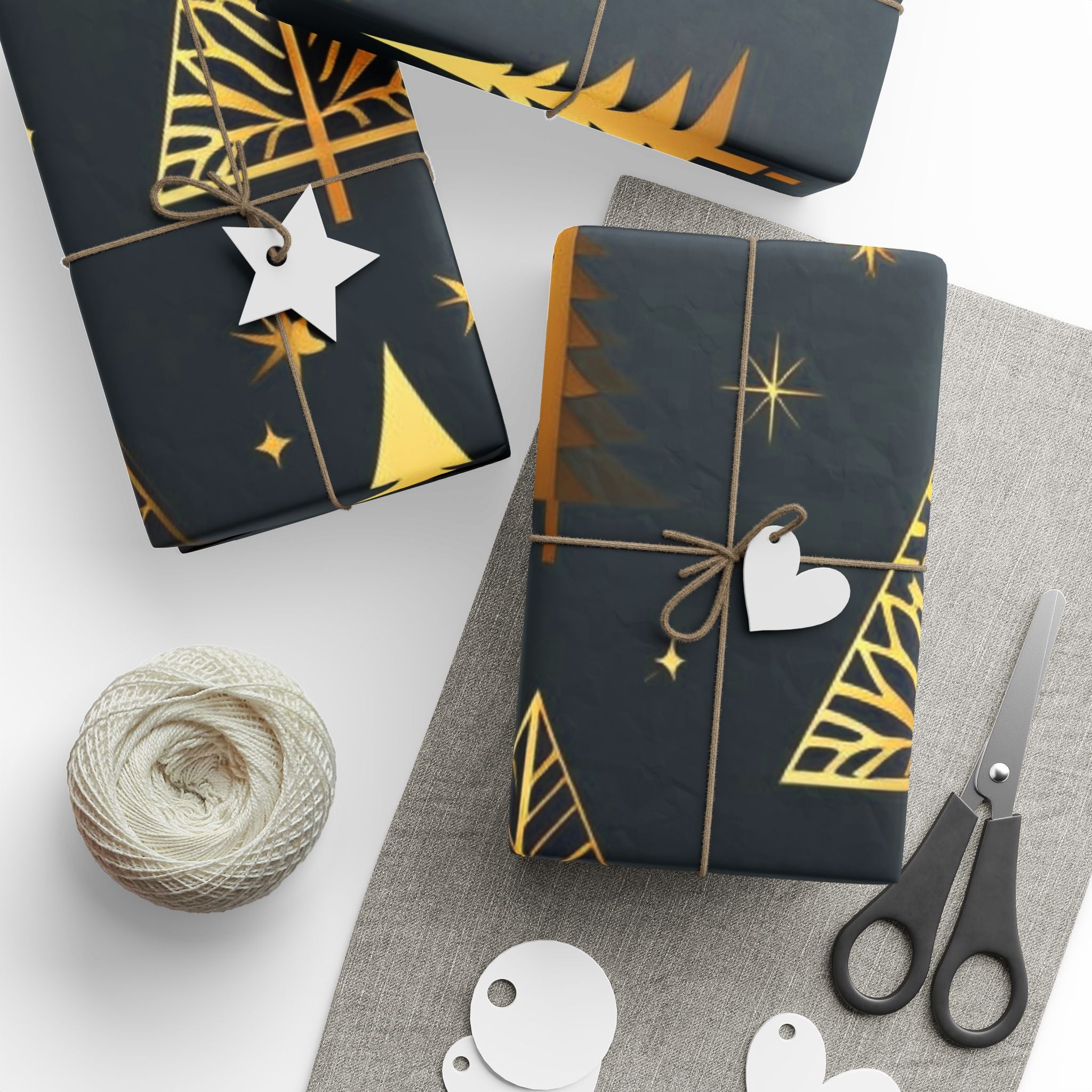 Custom-designed by us. A luxe, dark-background wrapping paper patterned with golden, stylized Christmas trees and little starbursts. The deep black canvas makes the metallic gold trees pop, creating a modern, elegant holiday look that reads like a chic, boutique finish. Printed on 90 gsm fine art...
