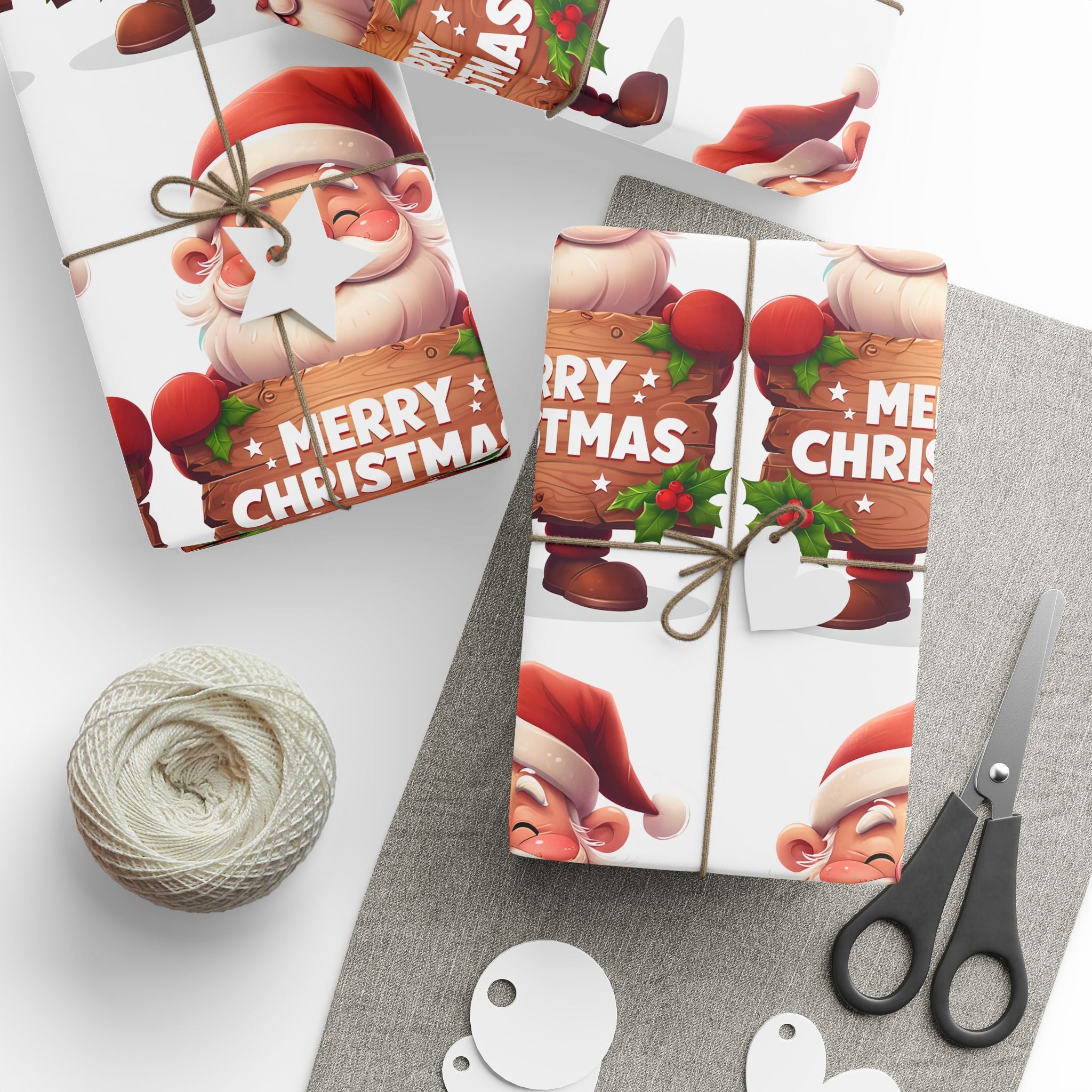 Custom-designed by us. Bring warm, nostalgic cheer to every gift with this festive wrapping paper. Cheerful, vintage-style Santas smile across the sheet, each holding a rustic wooden sign that reads βMerry Christmas.β The repeating pattern reads like a chorus of holiday greetingsβbright, playful,...