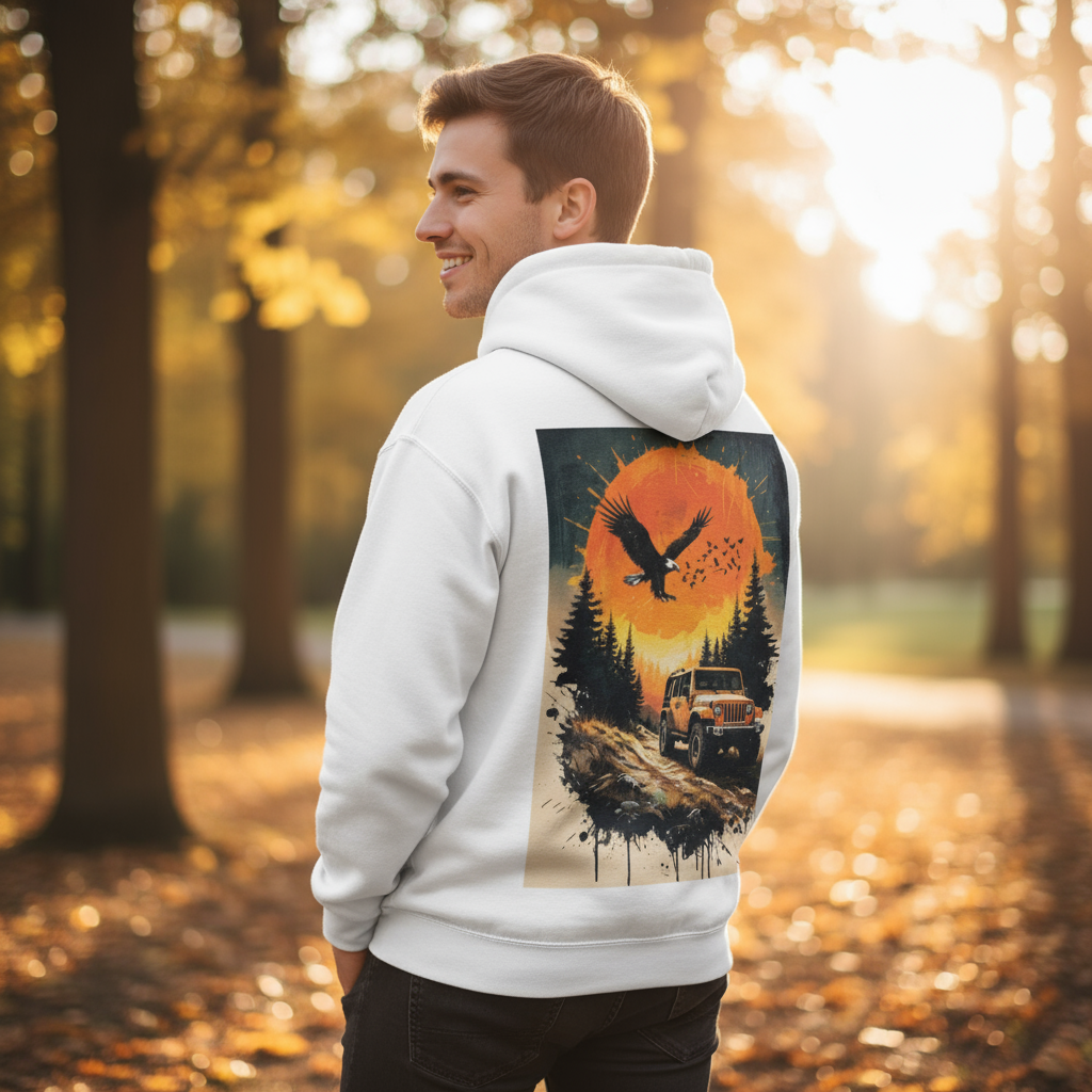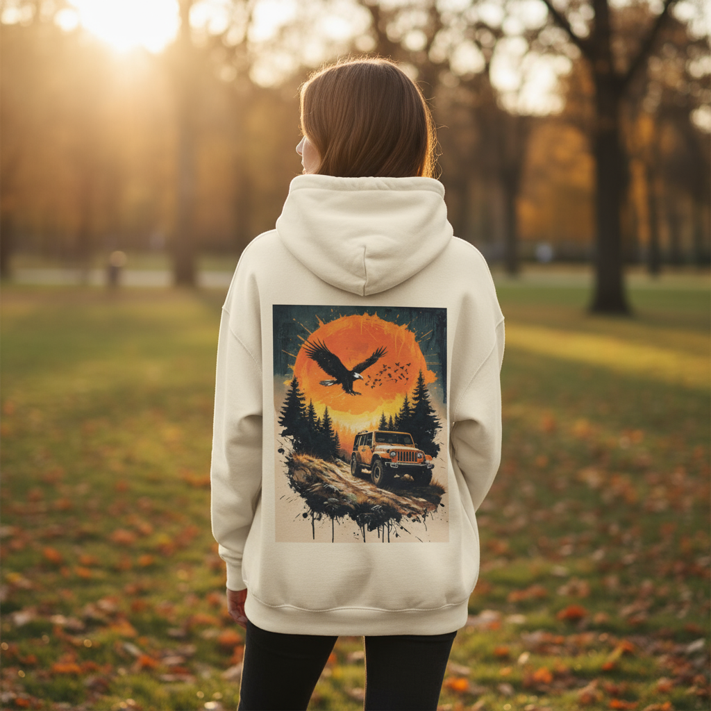 Custom-designed by us. Hit the trail in style with our Off-Road Wild Hoodie — a must-have for adventurers at heart. Featuring a striking back graphic of a rugged Jeep charging through the woods beneath a blazing orange sun and soaring eagle, this hoodie captures the spirit of freedom, nature, an...