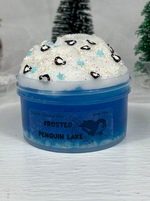eet Frosted Penguin Lake — the cutest winter escape in a jar! Inspired by a peaceful frozen pond on a snowy morning, this slime feels like stepping into a cozy winter wonderland. The bottom layer is a glassy, icy-blue clear slime that looks just like a frozen lake, while the top layer is a fluffy white cloud slime dusted with shimmering glitter that mimics fresh snowfall.